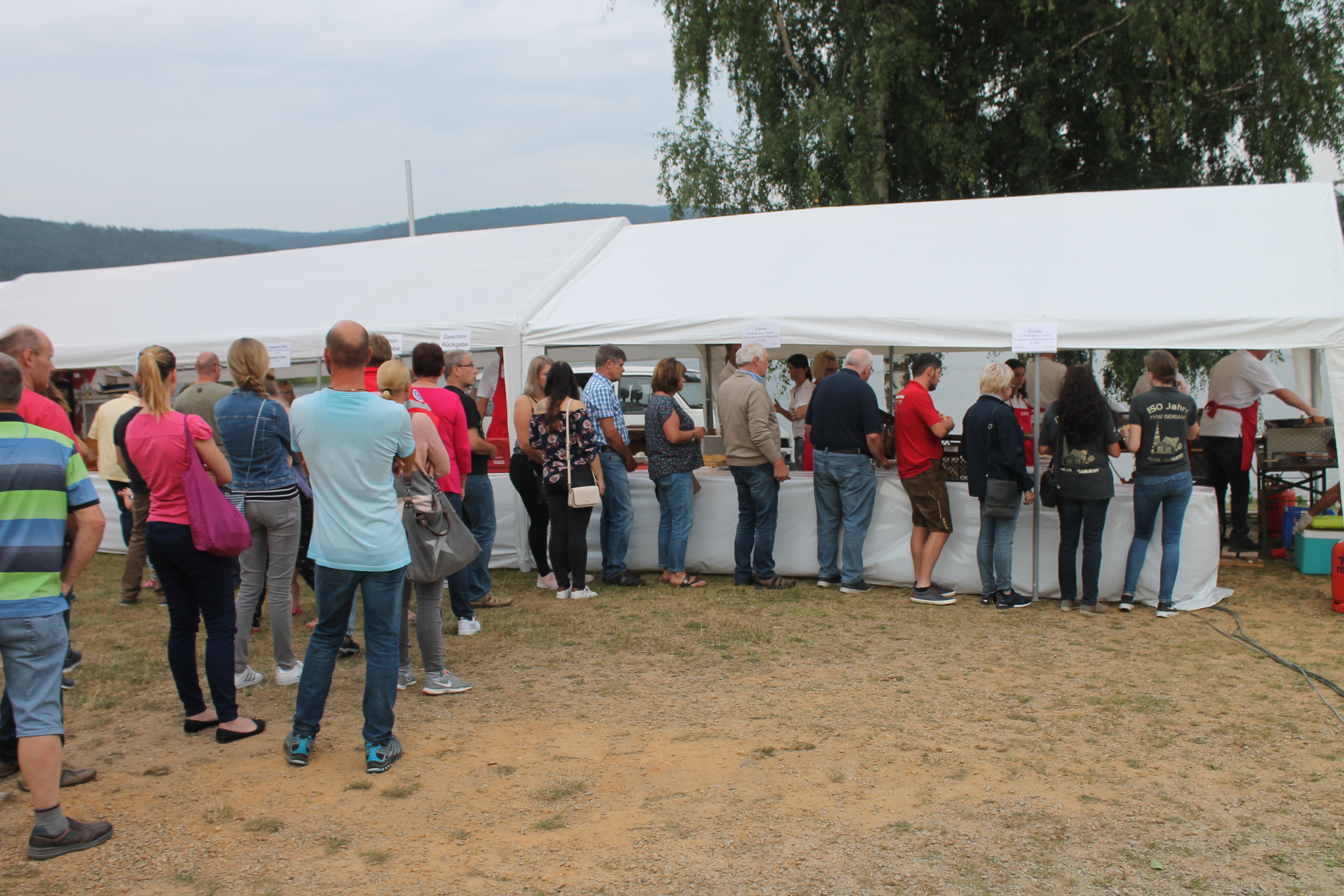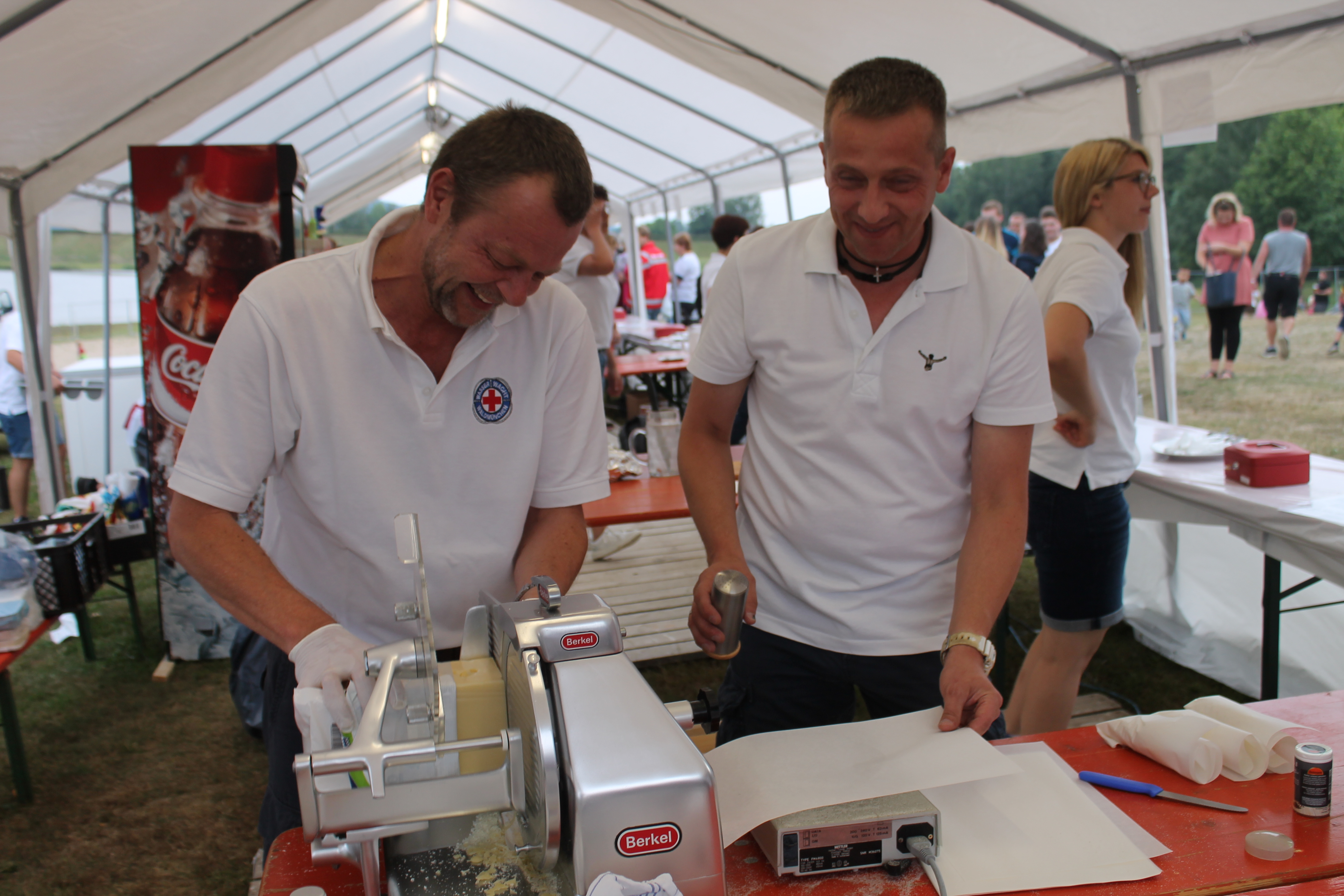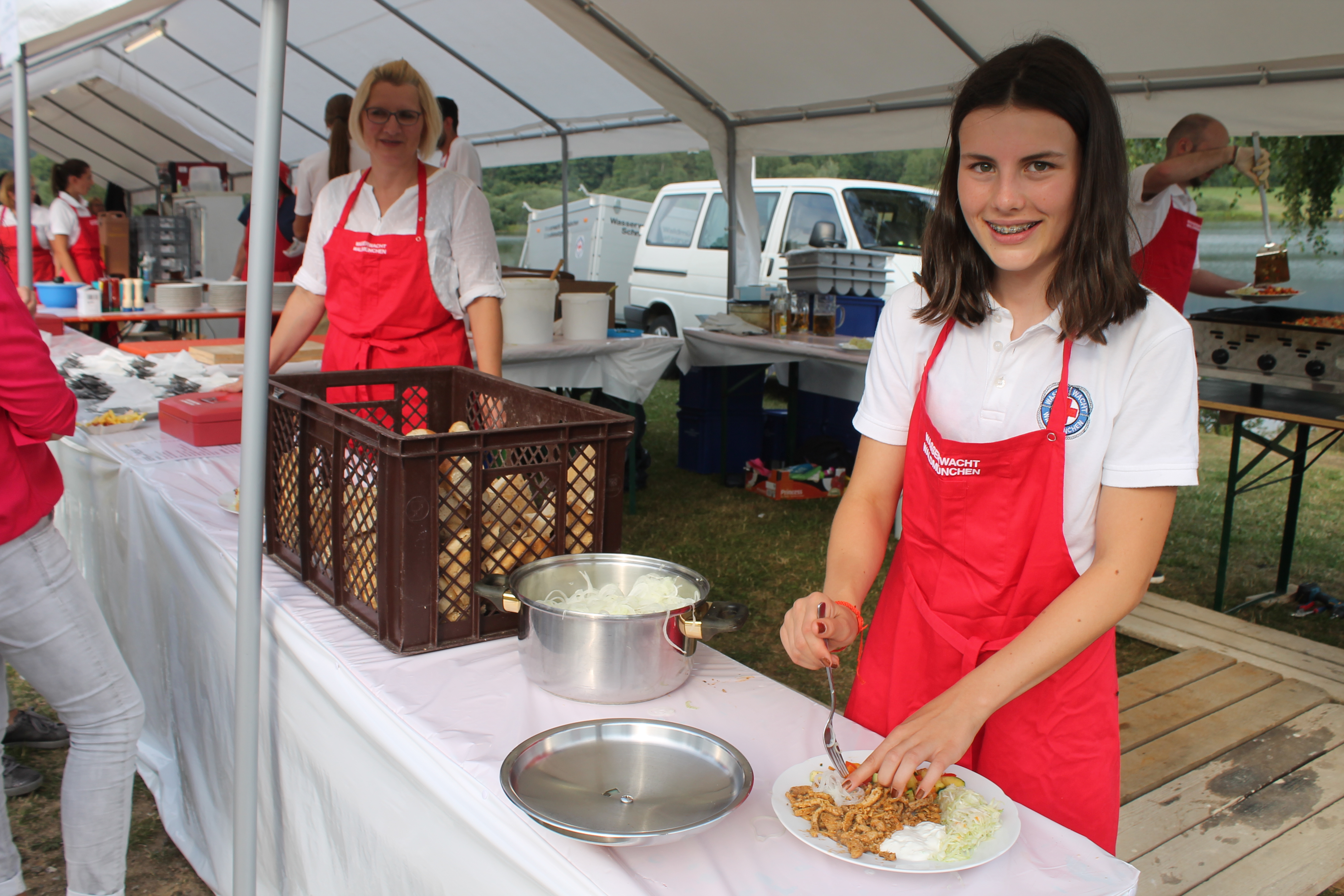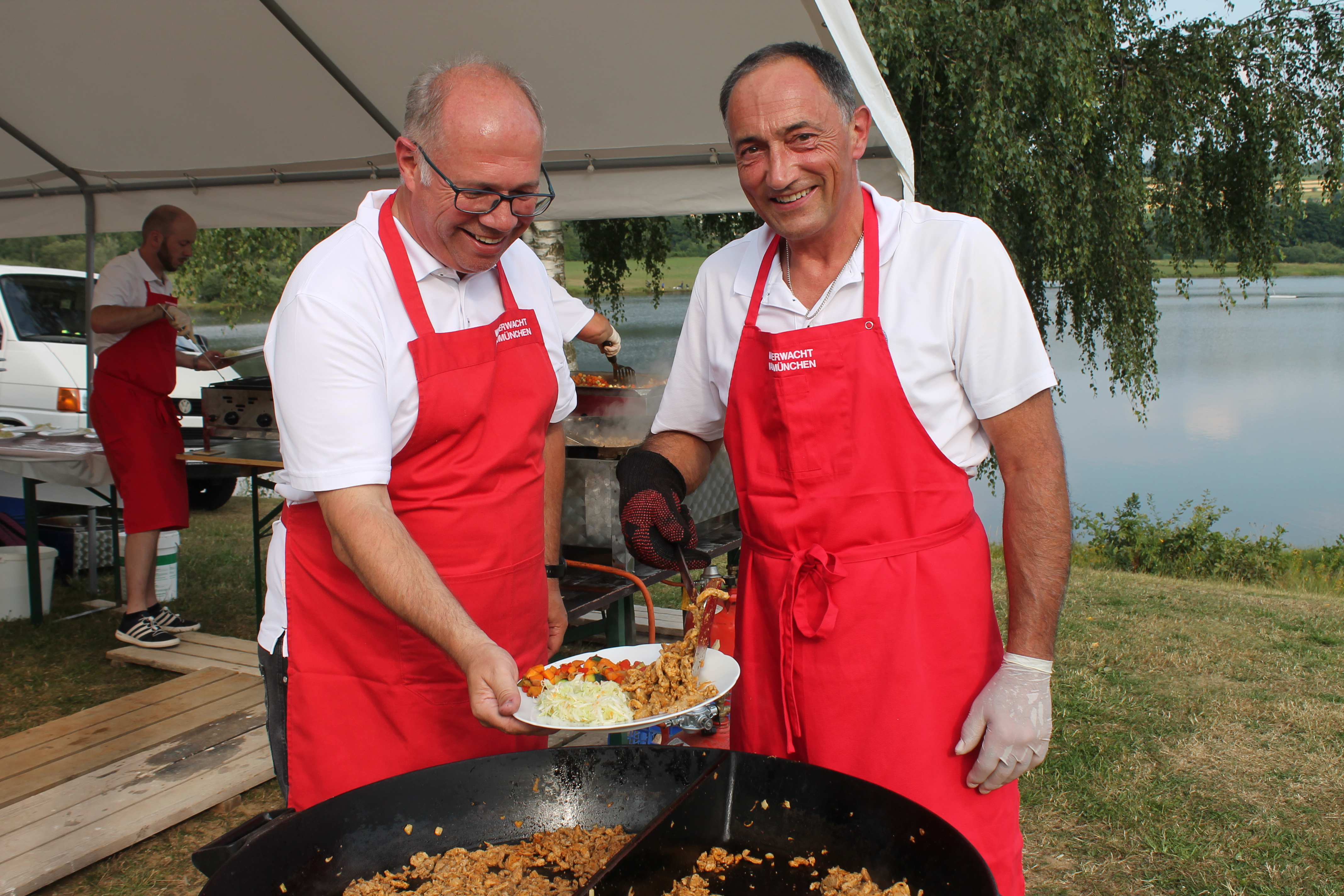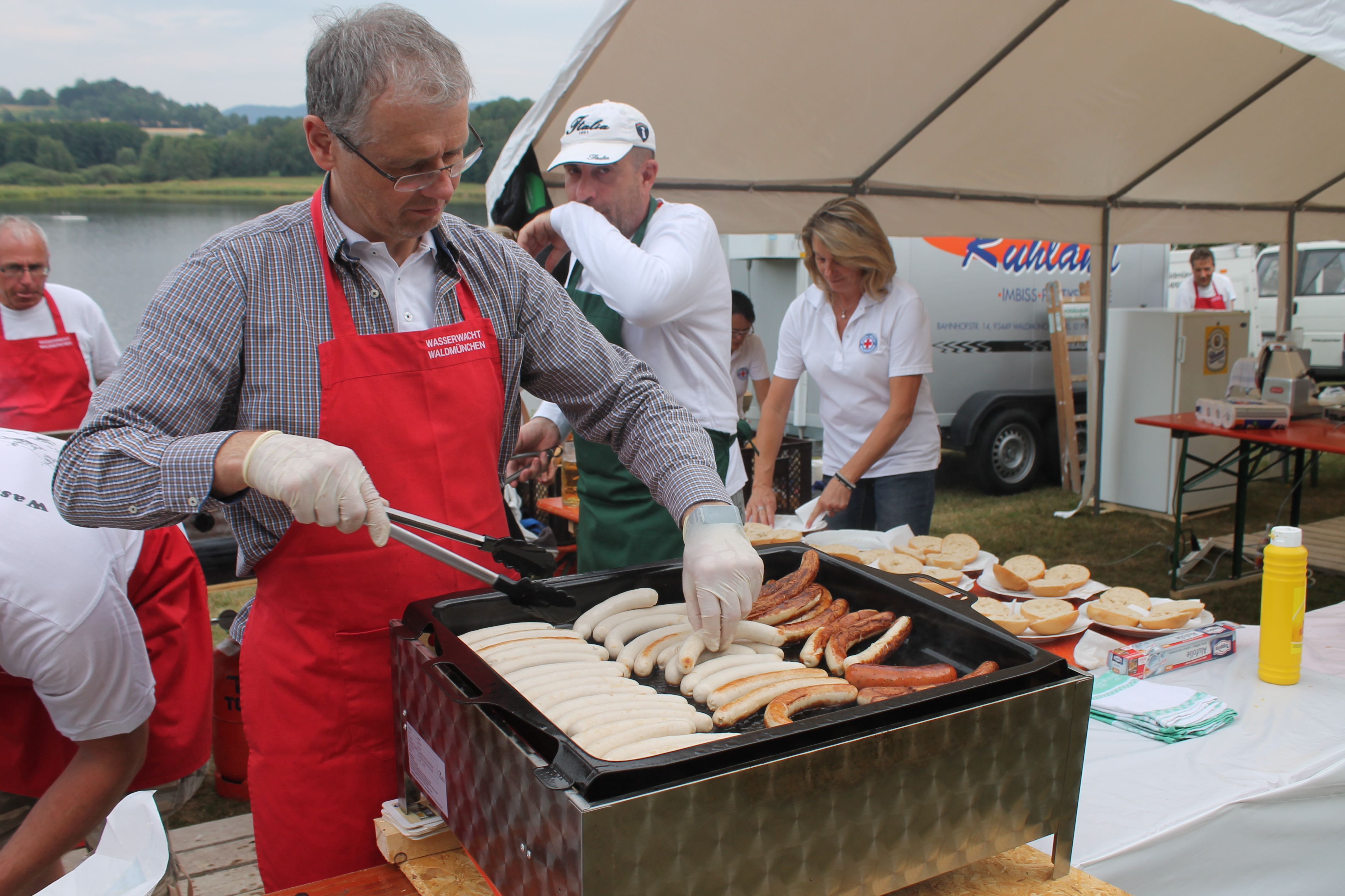 Die Waldmünchner Wasserwacht hat anscheinend einen Vertrag mit Petrus abgeschlossen. Freitag 10 Minuten vor Beginn des Seefestes regnete es in Waldmünchen noch und man hoffte, dass das Wetter durchhält. Doch dann war es trocken und es herrschten perfekte sommerliche Seefesttemperaturen. Gut gelaunte Menschen aus Nah und Fern sowie Urlauber kamen dann in Scharen. Die Gäste nahmen sogar die Plätze entlang der Fackeln des Strandes ein. Denn das 52. Seefest hat mittlerweile Kultstatus und ist im Veranstaltungskalender für viele bereits eingetragen. Die Gourmets belagerten die Stände, denn für jeden Geschmack war etwas dabei. Das Gyros mit Zaziki und auch das Grillgemüse sowie die Calamares sind heißbegehrt. Gerne genoss der eine oder andere ein Gläschen Rot- oder Weißwein. Die Kinder lieben eine Portion Pommes oder eine Bratwurstsemmel. Bei den warmen Temperaturen war auch der Wurstsalat oder der Käse mit einer Breze gefragt. Die Kuchen- und Tortentheke sah aus wie in einer Konditorei. Auf der Spielwiese der Jugendwasserwacht um Leiterin Annalena Maurer konnten sich die Kinder beim Federball spielen, Stelzenlaufen oder Ringe werfen austoben. Beim Kinderschminken konnten sich die jüngsten Besucher zum Tiger, Spiderman, Marienkäferoder Einhorn verwandeln lassen. Die Partyband Trixx aus Neuburg am Inn sorgte mit ihrem Repertoire von ABBA, AC/DC bis hin zu den aktuellen Charts für die musikalische Unterhaltung und forderte Jung und Alt zum Tanzen auf. Bei Shakira und Andreas Gabalier wackelten die Hüften und natürlich durfte der Oktoberfesthit Cordula Grün nicht fehlen. Im Jahre 1988 zum 25. Geburtstag der Wasserwacht Waldmünchen wurde das Brillantfeuerwerk eingeführt und ist seit dem nicht mehr wegzudenken. Dieses verzauberte auch dieses mal wieder den Himmel in ein tolles Farbenspiel und sorgte für viele „oh“ und „ah“ mit anschließenden tosenden Applaus. Wer immer noch weiterfeiern wollte, für den gab es noch das „Rettungsboot“: Die Cocktail- und Schnapsbar. Vorsitzender Andreas Dietl bedankte sich bei seinen vielen Helfern, die im Einsatz sind. Auch die Jugendwasserwacht wurde bereits beim Verkauf der Brezen und Leuchtknickbänder miteinbezogen. Die Bedienungen bekamen von den Nachwuchsrettungsschwimmer Unterstützung, indem sie mit Bollerwägen die alkoholfreien Getränke ausfuhren. Auch beim Auf- und Abbau war jede helfende Hand gefragt, sodass am Samstag der Strand wieder den Badegästen gehörte.
