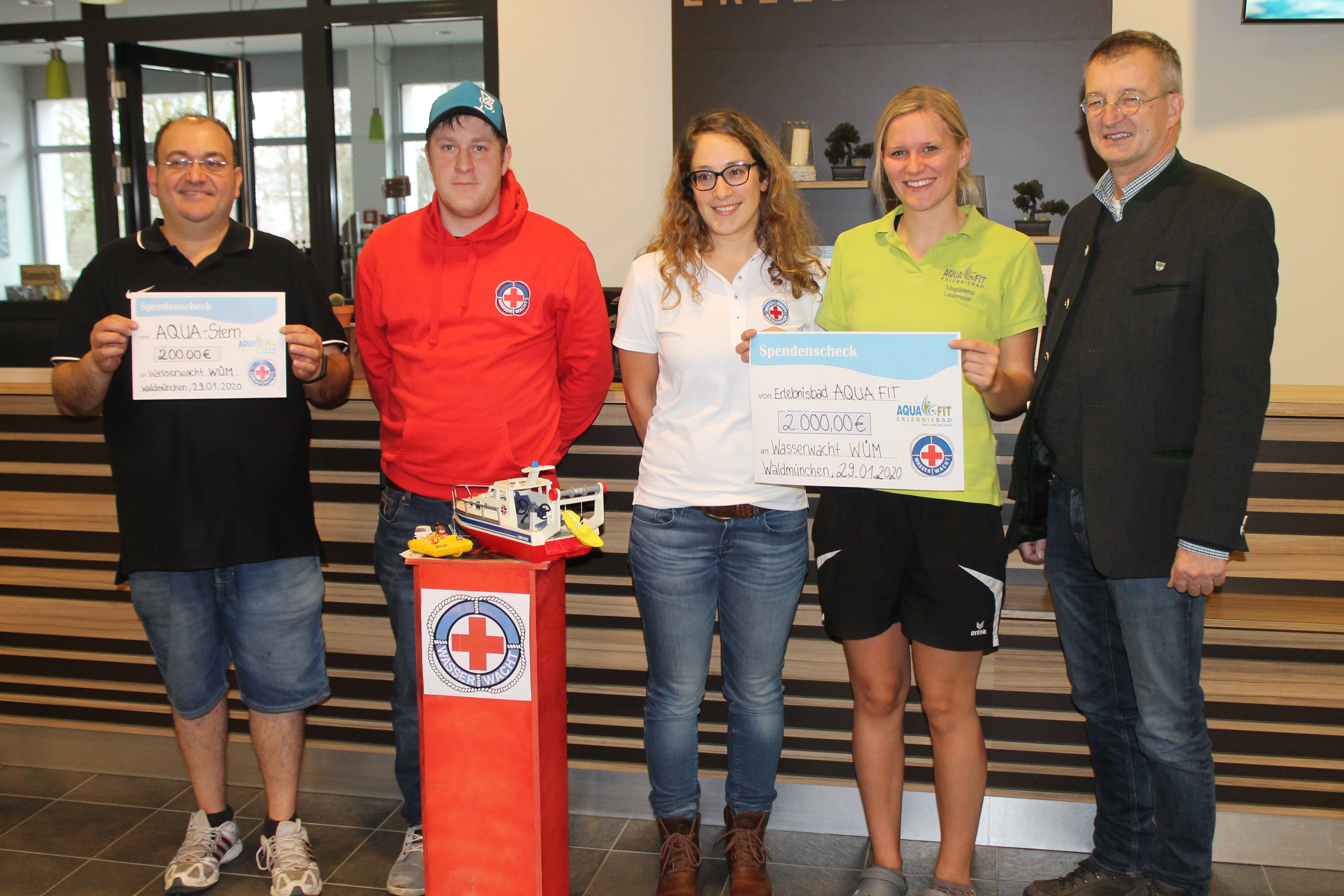 Und die Badegäste zeigten sich solidarisch. So füllte sich die Spendenbox zusehends. Zu den Tageseinnahmen, die ebenfalls gespendet wurden, gab die Stadt schließlich noch ein “Zuckerl” dazu, so dass die beiden Vorsitzenden der Wasserwacht, Andreas Dietl und Stefanie Kurzendorfer, am Mittwoch bei der Spendenübergabe einen Scheck über 2.000 Euro in Empfang nehmen konnten. Auch das Restaurant AquaStern im AquaFit beteiligte sich an der Spendenaktion und überreichte einen Scheck über 200 Euro.